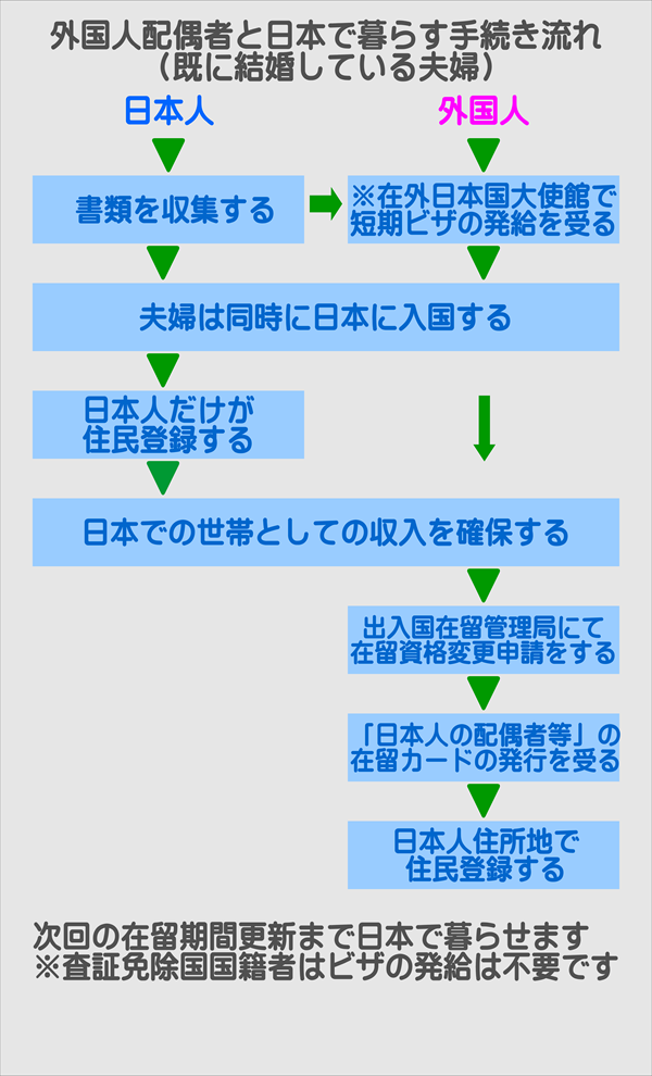 | 認定証明書を在外日本国大使館領事館に提出し、外国人配偶者が日本国査証を受ける。 | 日本人配偶者が身元保証人(※2)となり出入国在留管理局にて「日本人の配偶者等」への在留資格変更許可申請をする。 |