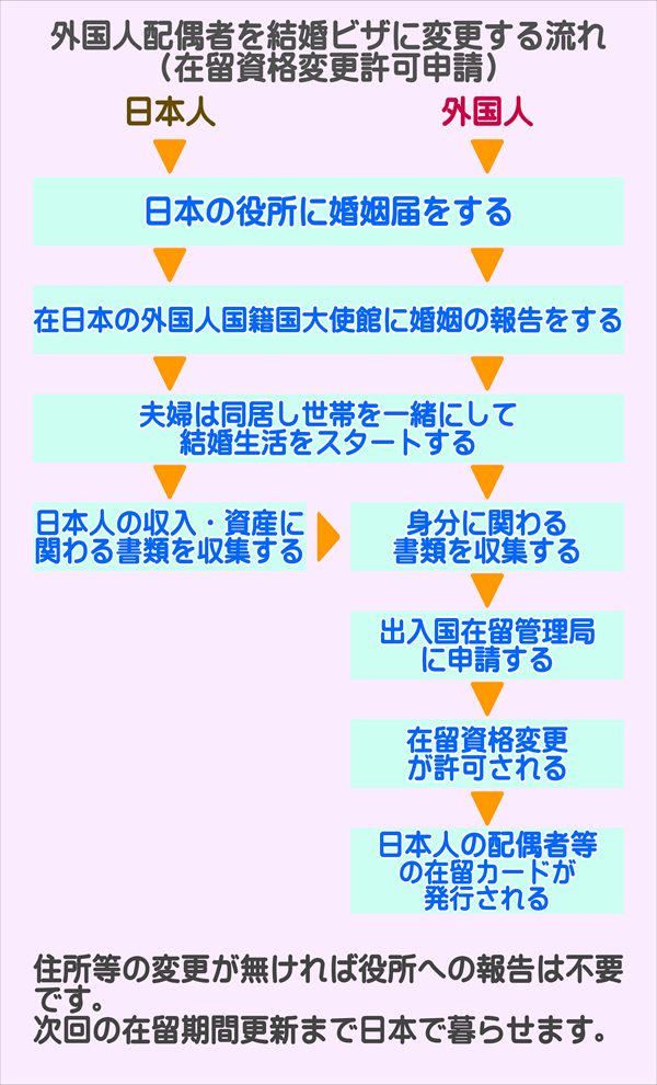 - 「日本人の配偶者等」への在留資格変更には、婚姻手続きと同居をすることが必須です。