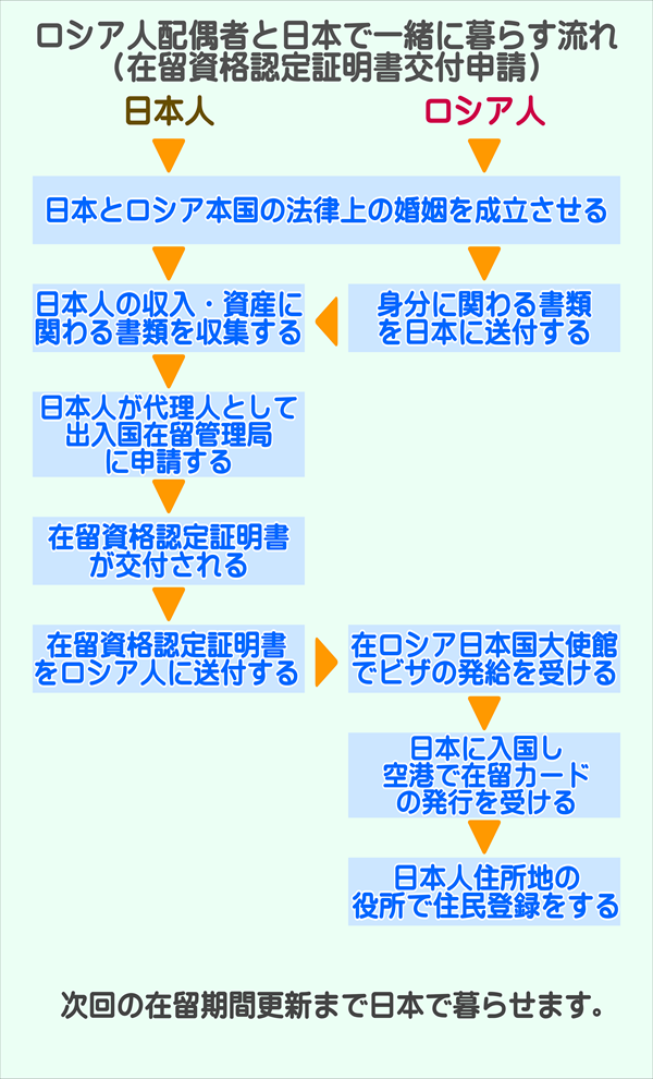 ロシア人配偶者が日本に居ない場合は日本人配偶者が代理人となり、事前に住所地管轄の地方出入国在留管理局で、手続き「在留資格認定証明書」交付申請をすることになります。