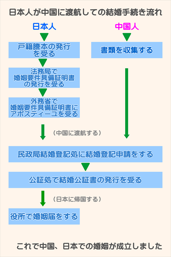 日本人は中国に渡航する前に法務局にて婚姻要件具備証明書の発行を受けてください。この婚姻要件具備証明書には外務省アポスティーユを付すことが必須です。婚姻要件具備証明書をもって中国に渡航し、お相手と二人で民政局登記処に出向き結婚登記、結婚証の発行を受けてください。