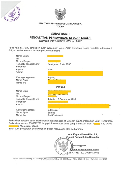 在日インドネシア総領事館でインドネシア人配偶者の婚姻具備証明書を発行。