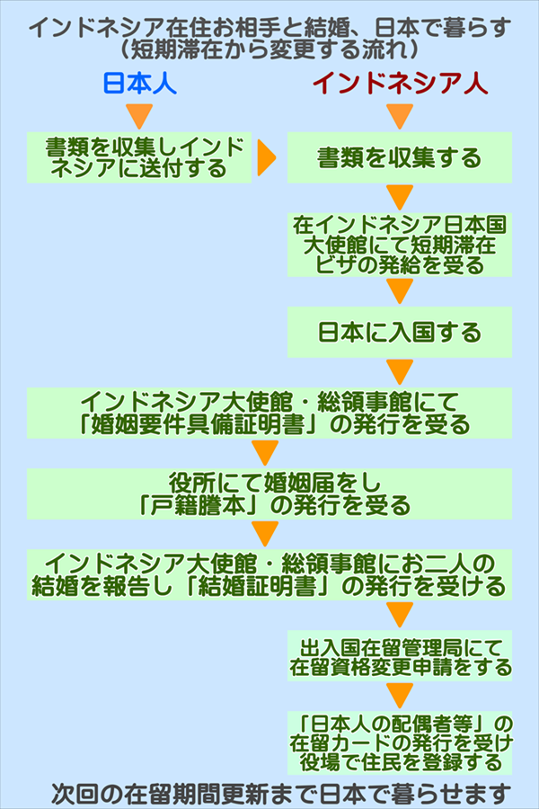- 先に日本で結婚し、結婚ビザに変更する流れ。